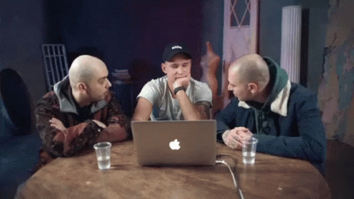 Restorator, Oxxxymiron, and a friend gathered around an Apple laptop, looking bored or deep in thought.