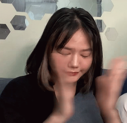 MNL48's Brei claps her hands with enthusiasm in front of a wall decorated with hexagonal mirrors.