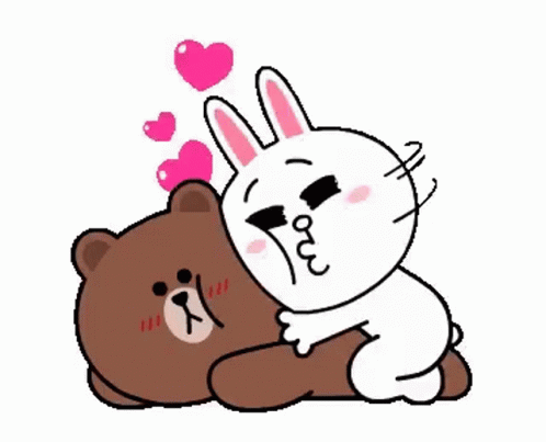 Brown bear and white rabbit cuddling with hearts, a sweet moment between friends.