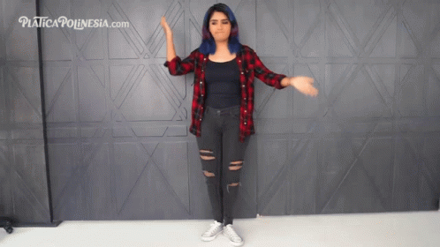 Karen Polinesia poses and dances in a red plaid shirt and ripped jeans.