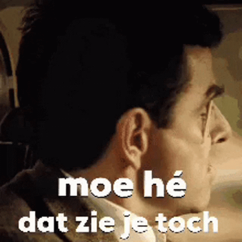 Mr. Bean struggles to stay awake in a car, using matchsticks to keep his eyes open, with Dutch text 'moe hé dat zie je toch'.