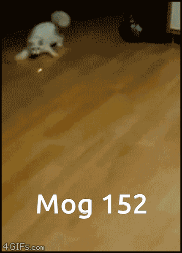 A playful white cat, known as Mogcat 152, rolls and tumbles on a wooden floor, enjoying its playtime.