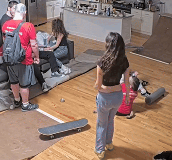 Letty dances energetically, falls to the floor, as others watch and react in a living room setting.