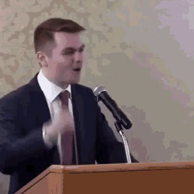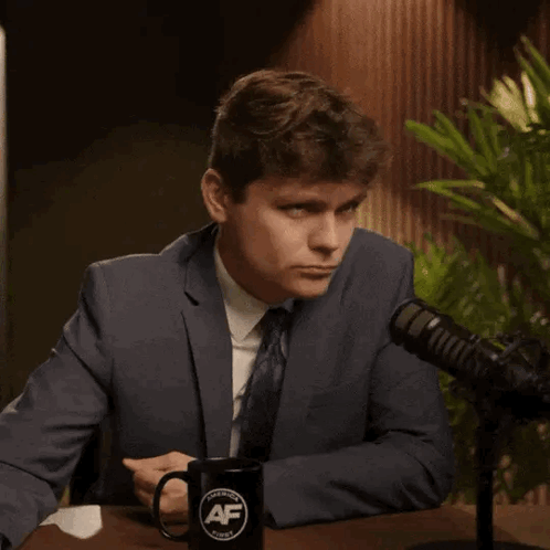 Nick Fuentes in a suit making a distinctive gesture with an 'America First' mug.