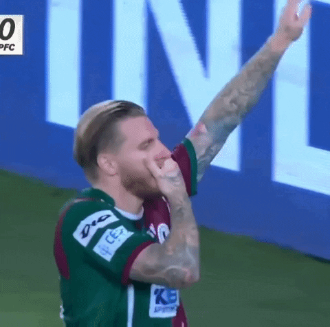 Jason Cummings of Mohun Bagan SG celebrates with a distinctive gesture during a football match.