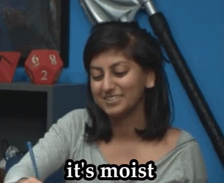 Revati Dhomse smiles and says 'it's moist' while sitting at a desk during the Saving Throw Show.