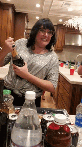 Mollymahoney excitedly pops a bottle of champagne, celebrating with a big smile in a kitchen.