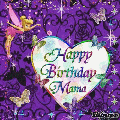 Animated purple greeting card with a fairy, butterflies, and 'Happy Birthday Mama' message in a heart.