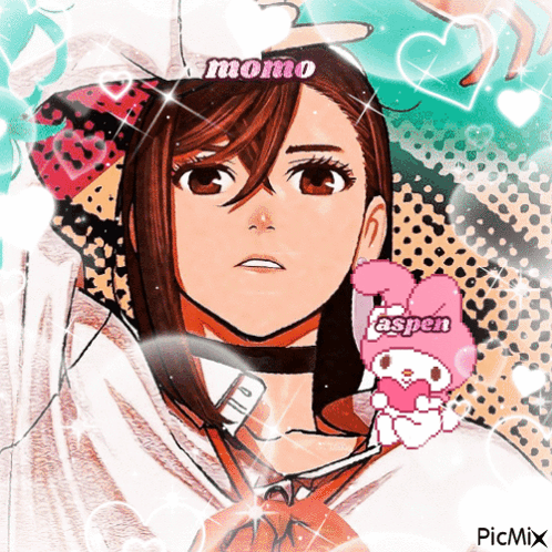 Momo Ayase from Dandadan in a vibrant anime aesthetic with hearts and a My Melody character.
