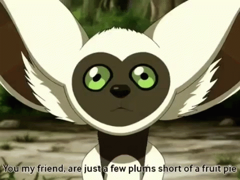 Momo from Avatar: The Last Airbender delivers a witty insult about being 'a few plums short of a fruit pie'.