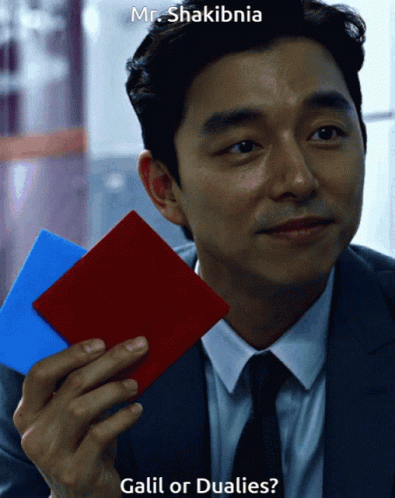 Momo presents a choice between Galil or Dualies, holding red and blue cards in a suit.