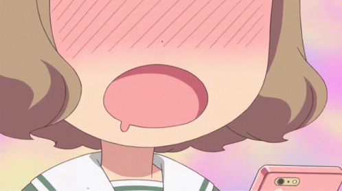 Yuki Kurihara from Momokuri blushes intensely, mouth agape, while looking at her pink phone.