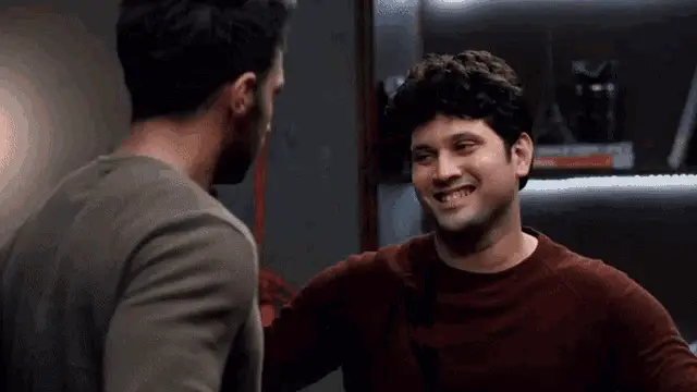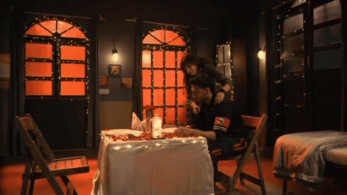 Monami and Shaleen share an emotional moment in a dimly lit room with warm background lights.