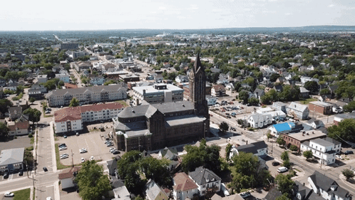 Aerial view of Moncton, New Brunswick, showcasing the city's layout and a prominent church.