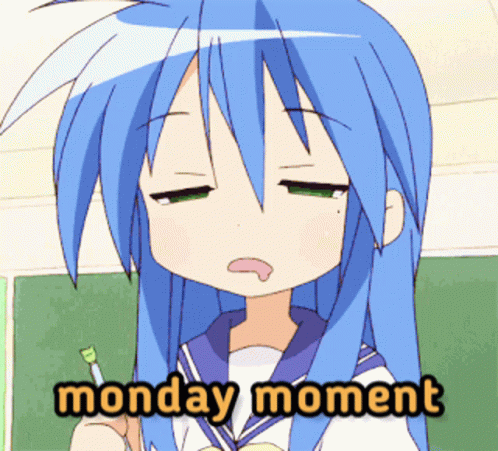 Konata Alkruhn's relatable Monday moment, looking tired with blue hair and a pencil.