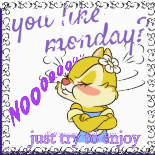 An animated chipmunk expresses dislike for Monday with a 'Nooooooo' before deciding to just try to enjoy the day.