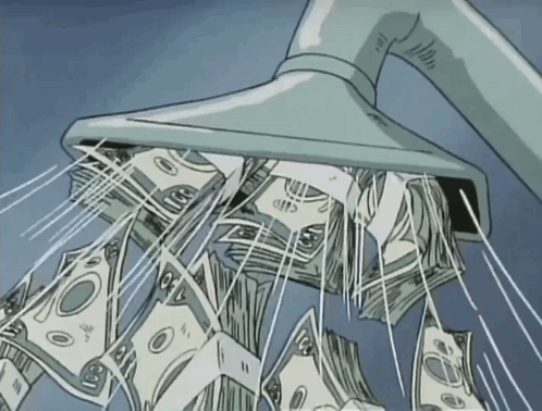 Anime-style animation of US dollar bills pouring out of a shower head like water.
