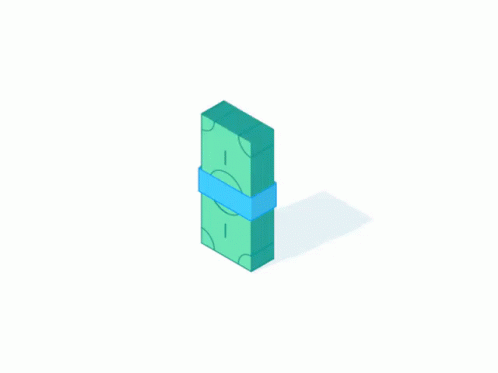 An animated stack of green money bills, tied with a blue band, with some bills flapping.