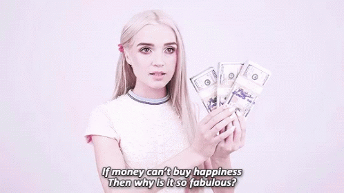 Poppy holds stacks of money, questioning why it's so fabulous if it can't buy happiness, reflecting her unique persona.