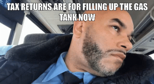 Man reacts to using tax returns to fill up the gas tank, reflecting on current economic realities.
