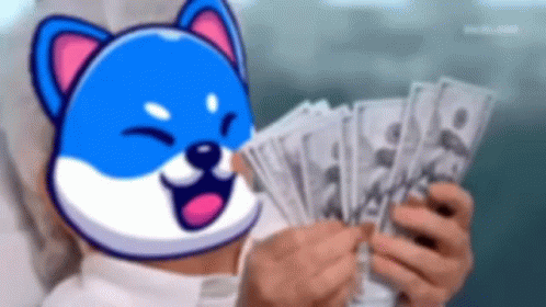 A cartoon dog meme character, possibly Vinu Coin, happily holds stacks of US dollar bills, symbolizing wealth.