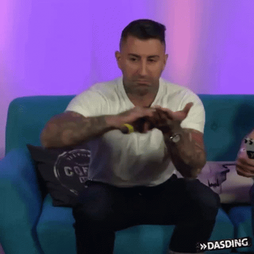 Sammy Amara, known from Dasding and Southside Festival, makes a heart shape with his hands on a blue couch.