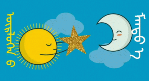 A cartoon drawing featuring a sun, crescent moon, and a gold star, with "Good Morning" in Mongolian script.