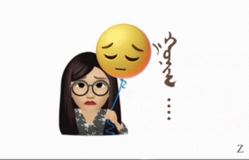 A woman with glasses holds a sad emoji balloon, with Mongolian script visible.
