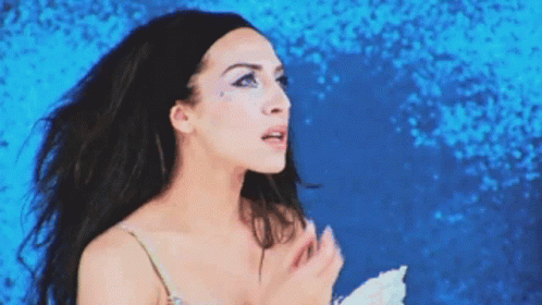 Monica Naranjo with dark hair and glittery makeup, posing against a blue background.