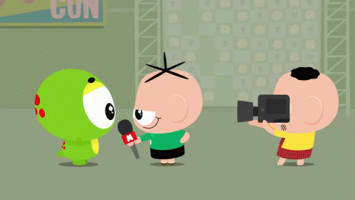 Monica Toy characters Mauricio, Cascão, and Cebolinha are seen at a convention, with Mauricio being interviewed.