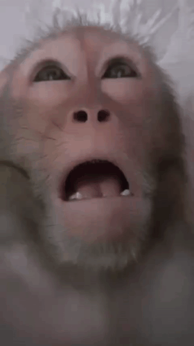 A close-up of a monke with a shocked expression, looking up with its mouth open.