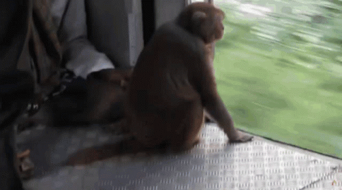 A monkey sits on a train, looking out the window at the passing scenery.