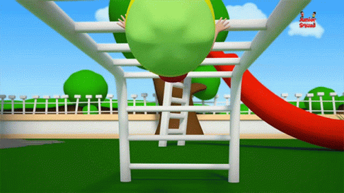 A Junior Squad cartoon kid hangs upside down from monkey bars in a vibrant playground, smiling playfully.