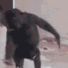 A person in a dark outfit, resembling a monkey, dances energetically in a snowy environment.