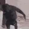 A very fat monkey sits on the ground, enjoying a piece of food.
