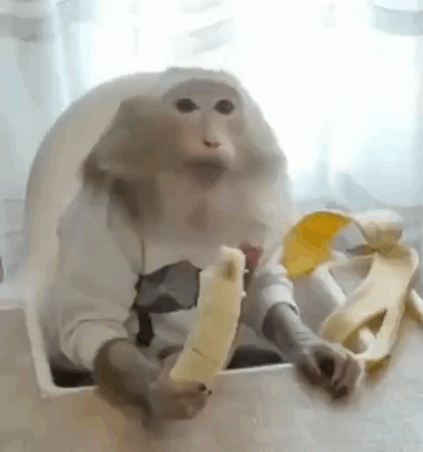 A monkey, associated with Игорь Буток, sits in a high chair and eats a banana.