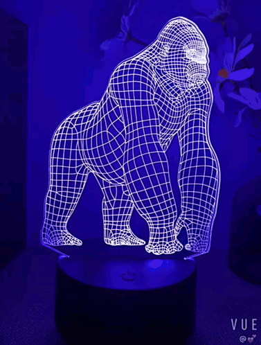 Mesmerizing 3D wireframe gorilla light sculpture changing poses and colors, creating an awesome vibe.
