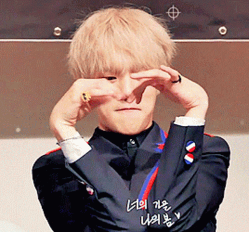 Monsta X member Minhyuk makes a cute heart gesture with his hands, smiling brightly for the camera.