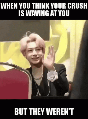 Monsta X's Hyungwon in a relatable meme about thinking your crush is waving at you, but they aren't.