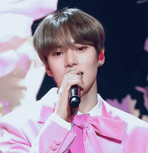 Monsta X member Minhyuk sings into a microphone, smiling brightly while wearing a pink suit.