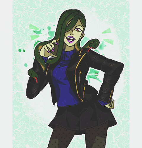 Vera, the confident gorgon from Monster Prom, striking a smug pose with her green hair and snakes.