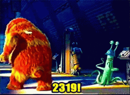 A monster from Monsters Inc. has a sock on its back, leading to a '2319' contamination alert.