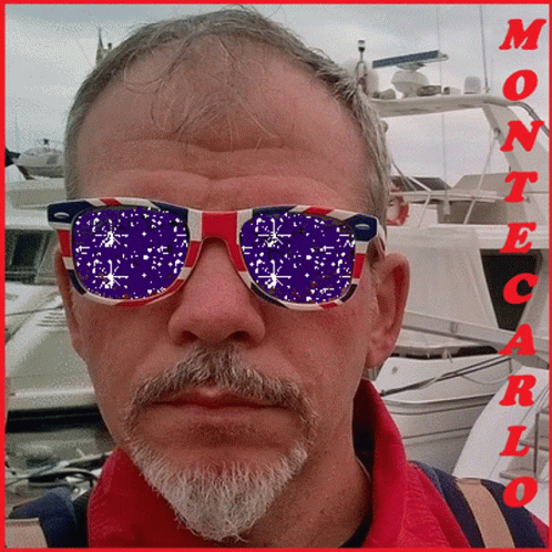 A man with a beard wearing Monte Carlo cool shades with a distinctive red, white, and blue design.