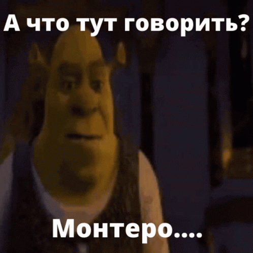 Shrek says 'What is there to say?' followed by 'Montero...' in Russian.
