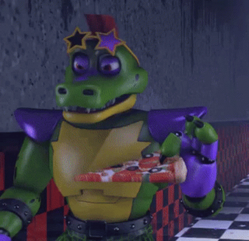Monty Montgomery Gator, the green robot, enjoys a slice of pizza in this animated clip.