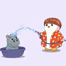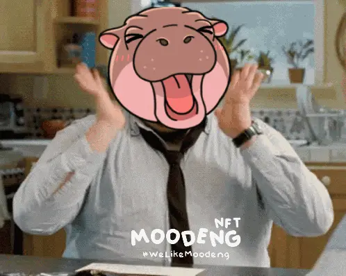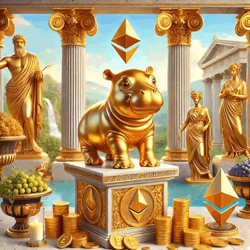 A golden Moodeng Moo Deng hippo statue dances on an Ethereum pedestal, surrounded by gold coins and ancient Greek-style statues.