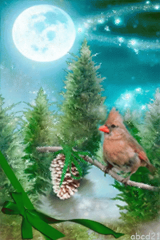 A beautiful digital painting of a cardinal bird perched on a pine tree branch under a full moon, with sparkling effects.