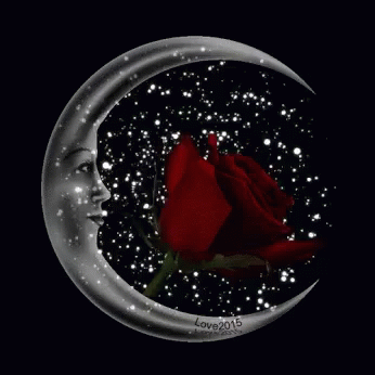 A beautiful crescent moon with a serene face, surrounded by sparkling stars, featuring a vibrant red rose.