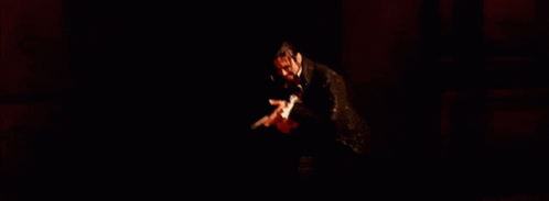 Florent Mothe as Antonio Salieri performs dramatically on stage in Mozart L'Opéra Rock, holding a quill.