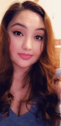 Mora, a woman with long brown hair, takes a selfie, wearing a blue shirt and pink lipstick.